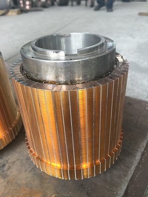 V-ring commutators are the most common type of commutator. They are available in a wide range of sizes, from two inches to several feet in diameter. Appropriate to most applications, v-ring commutators can have different riser styles to accommodate different sizes and coil configurations. V-ring commutators are designed with the copper and mica segment pack retained on the inside. The interior of the segment pack assembly is cut in a dovetail, typically using 3° and 30° angles. A steel assembly including a spool for the center and two caps for either end, is then used to retain the segment pack. Matching angles on both caps fit into the cut dovetail angles on the segment pack, (insulated by mica v-rings) forming a clamp which retains the copper bars by exerting pressure on the 30° interior angle.